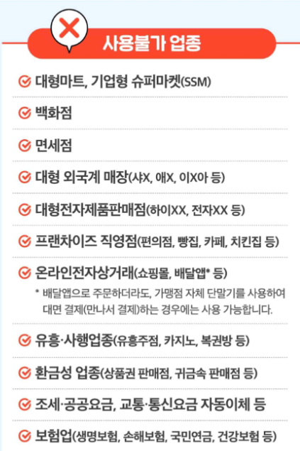 - 불가 업종: 대형마트, 백화점, 면세점, 온라인 쇼핑몰, 유흥·사행 업종 등