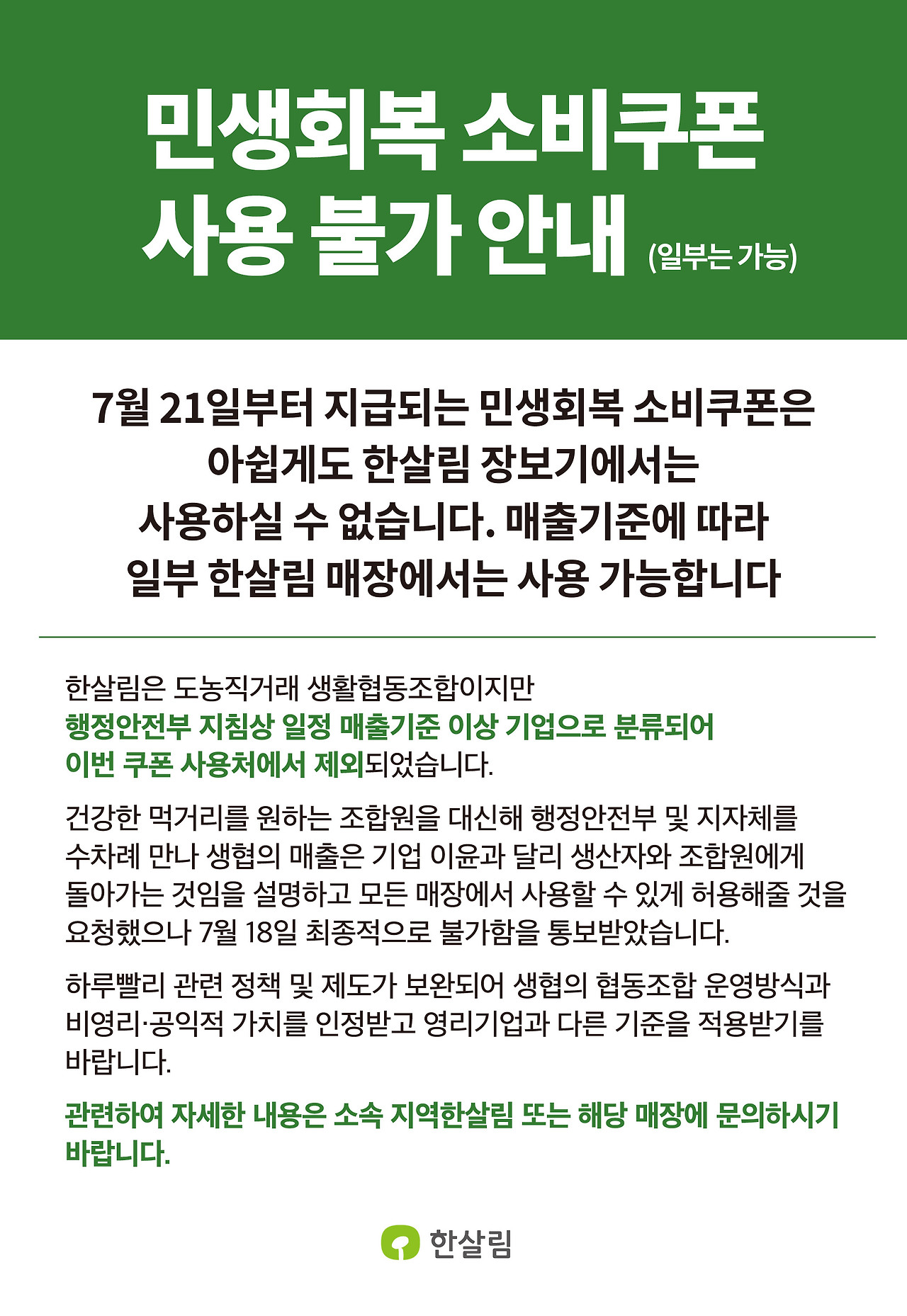 A. 민생회복 소비쿠폰 사용 불가 안내 (일부는 가능) 가까운 한살림 매장에서 확인하세요