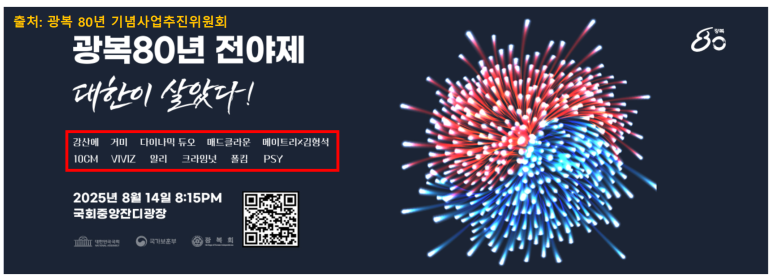 오는 8월 14일(목) 오후 8시 15분, 국회의사당 앞 잔디광장에서 ‘대한이 살았다!’ 전야제가 열립니다.