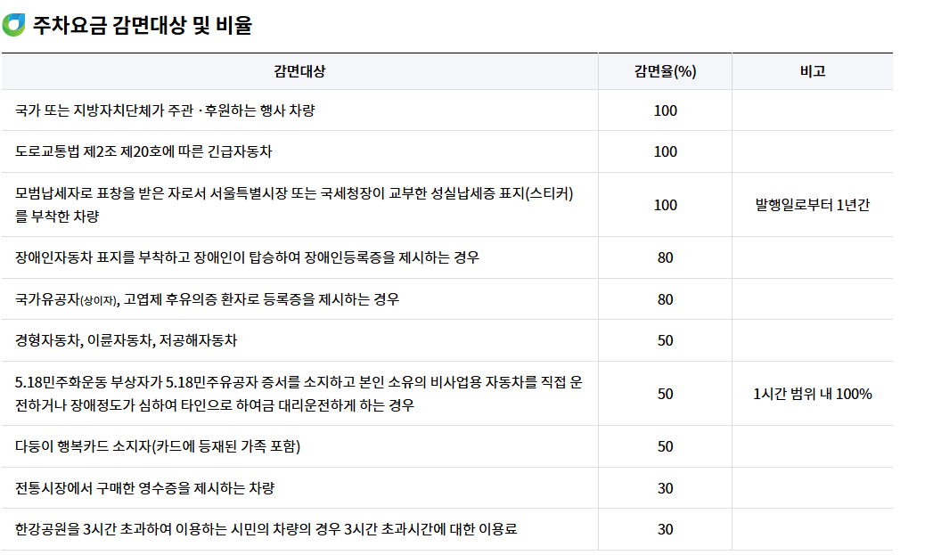 - 할인: 경차·다자녀 50%, 장애인·국가유공자 80%