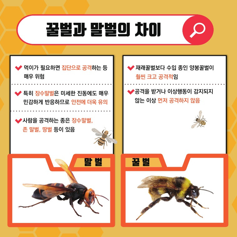 갑작스럽게 뛰거나 손을 휘두르면 벌을 자극할 수 있습니다. 발견 즉시 천천히, 조용히 자리를 벗어나세요. - 벌집을 건드렸다면 신속히 이동