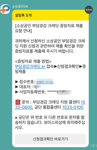 예를 들어, 저는 올해 신규로 사업자를 등록하여 과세증명이 없었던 관계로 카카오톡으로 추가 증빙자료 제출 요청을 받았습니다.