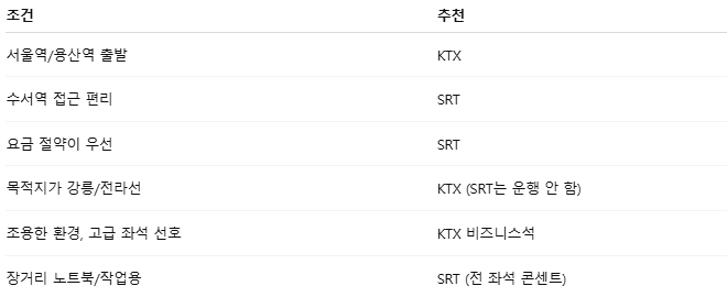 KTX와 SRT는 각각의 목적에 따라 선택이 달라질 수 있습니다.
