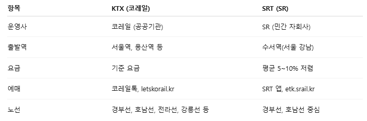 - SRT는 민간 자회사(SR) 운영으로 효율성 중심, KTX는 전국역 커버리지 강점.