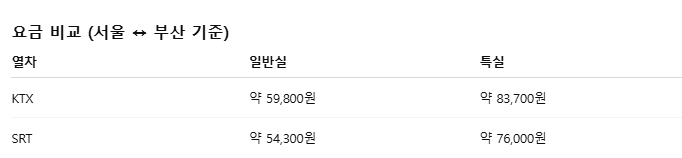 SRT는 동일 구간에서도 평균 5천 원 이상 저렴하며, 왕복 기준으로 1만 원 이상 절약할 수 있습니다.