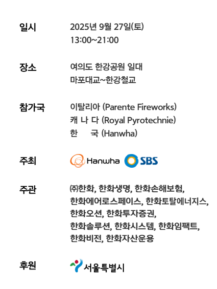 올가을 서울 밤하늘을 물들이는 서울세계불꽃축제 2025가 9월 27일(토) 여의도 한강공원에서 열립니다. 올해 슬로건은 Light Up Together(함께하는 빛, 하나가 되다). 해외팀은 이탈리아·캐나다, 그리고 피날레는 **한국(한화팀)**이 장식합니다.