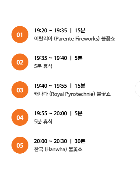 | 20:00~20:30 | 한국(한화) 팀 피날레—올해는 ‘시간’을 모티브로 한 신규 연출 |